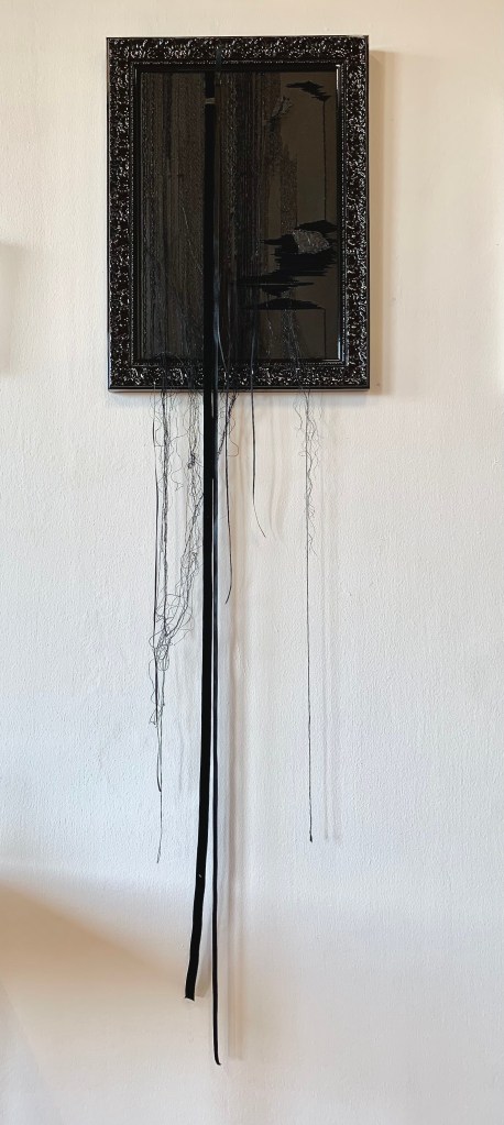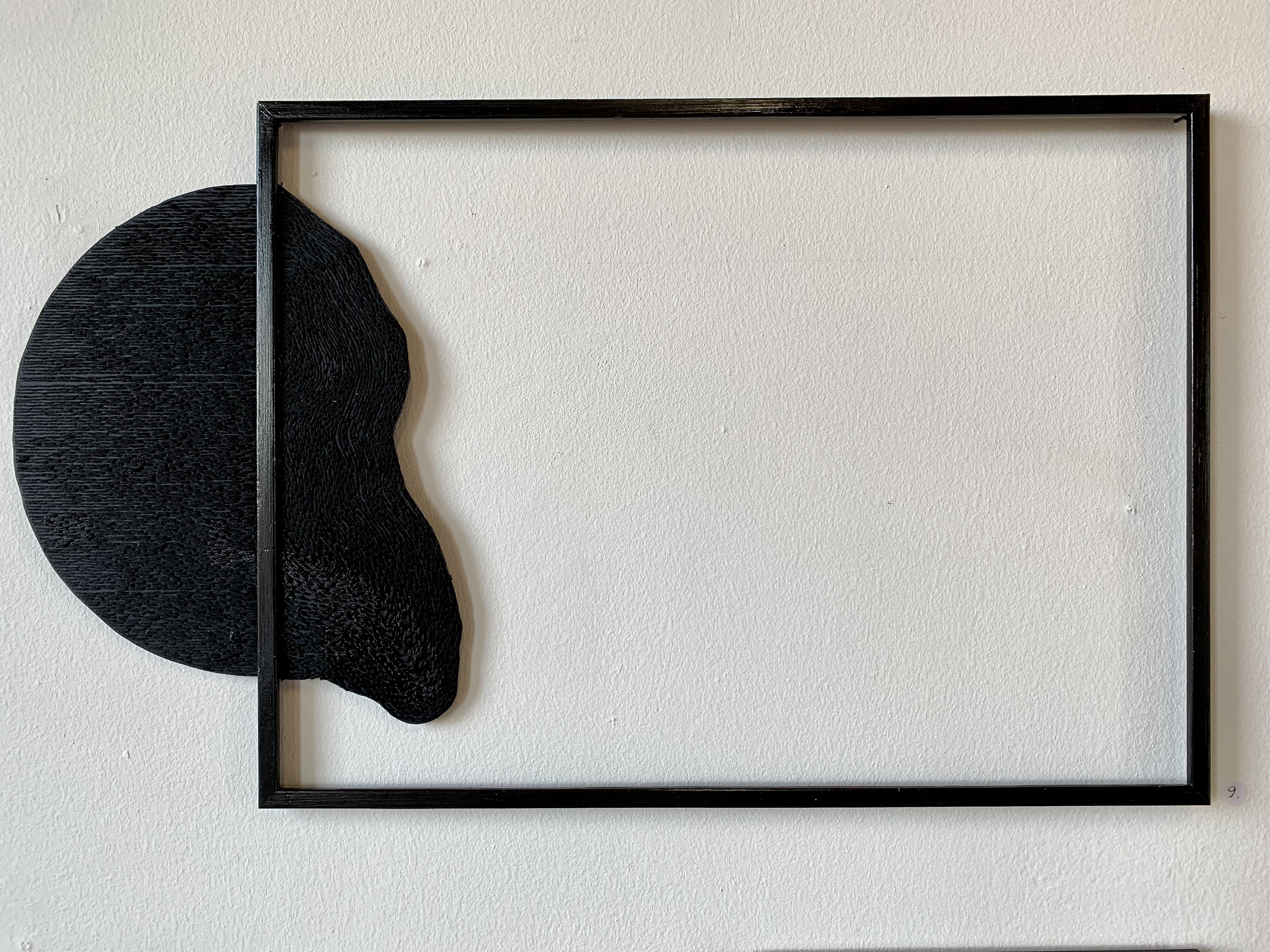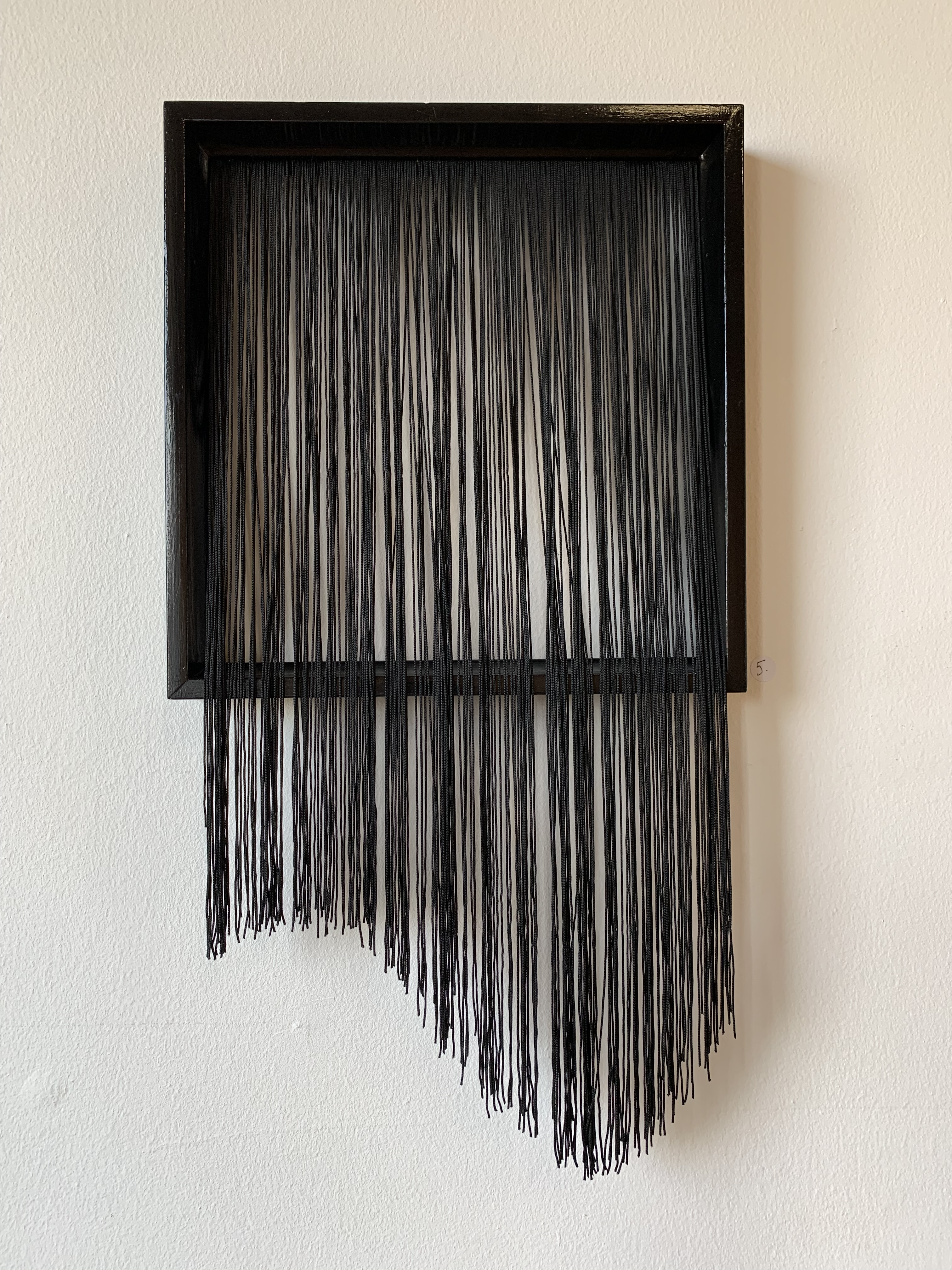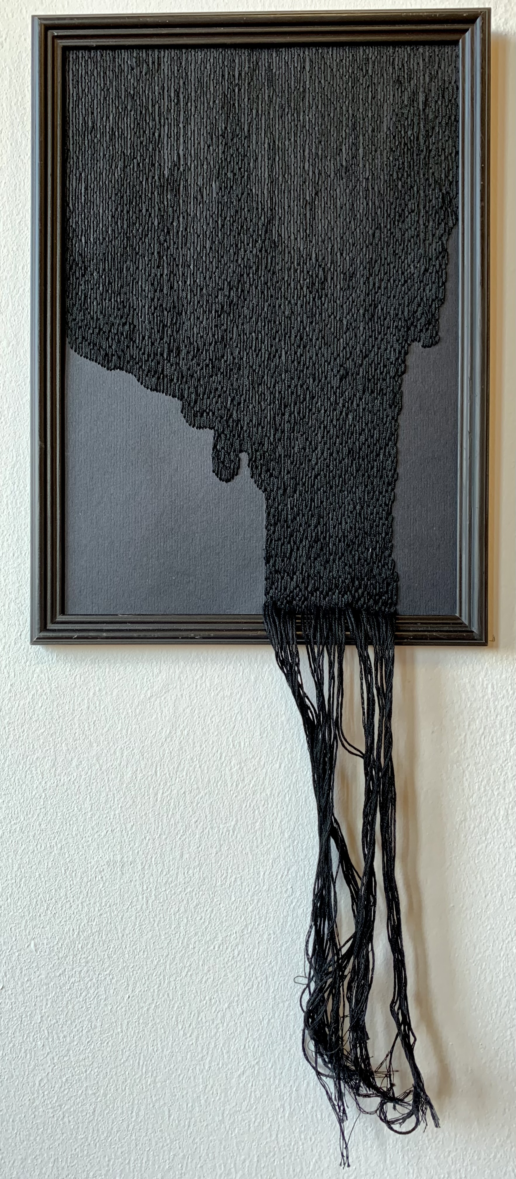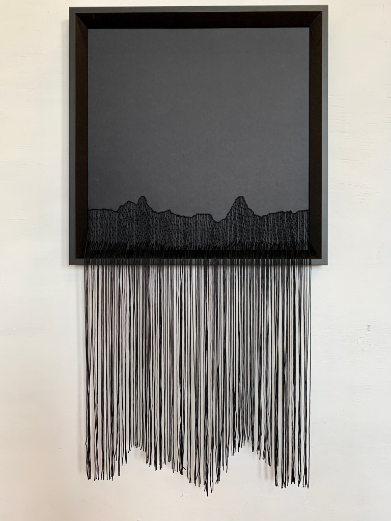 Ridå! 2023, 50 x 26 cm, lackerad träram, textil.Mörkret faller 2023, 30 x 40 cm, broderi på papperMörkret växer 2023, 30 x 30 cm, broderi på papperMer mörker 2023, 55 x 21 cm, broderi på papperUtanför/innanför 2023, 60 x 35 cm, broderi på papper, capakartong, lackerad träramJag är inte rädd för mörkret 2023, 31 x 74, 5 cm, broderi på papper, lackerad träramBristande vandel 2023, 44 x 160 cm, broderi på papper, lackerad träramBristande vandel 2023, detalj