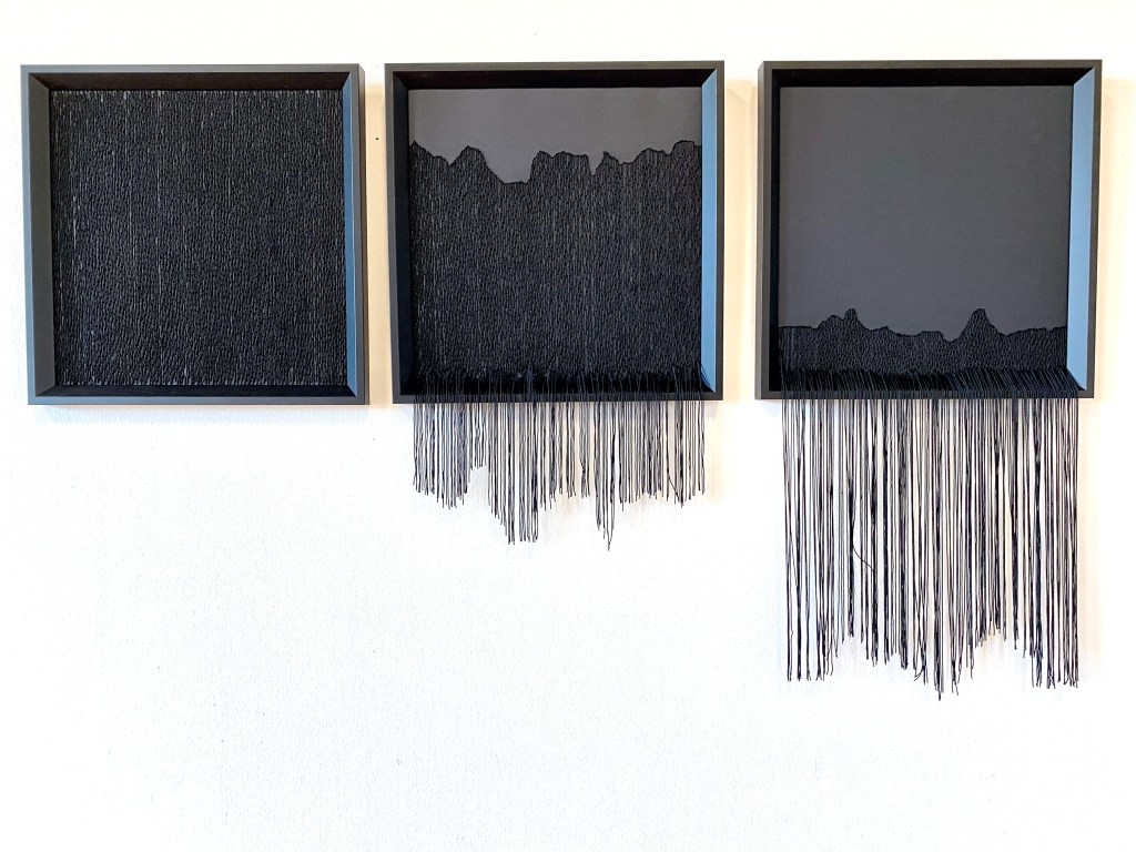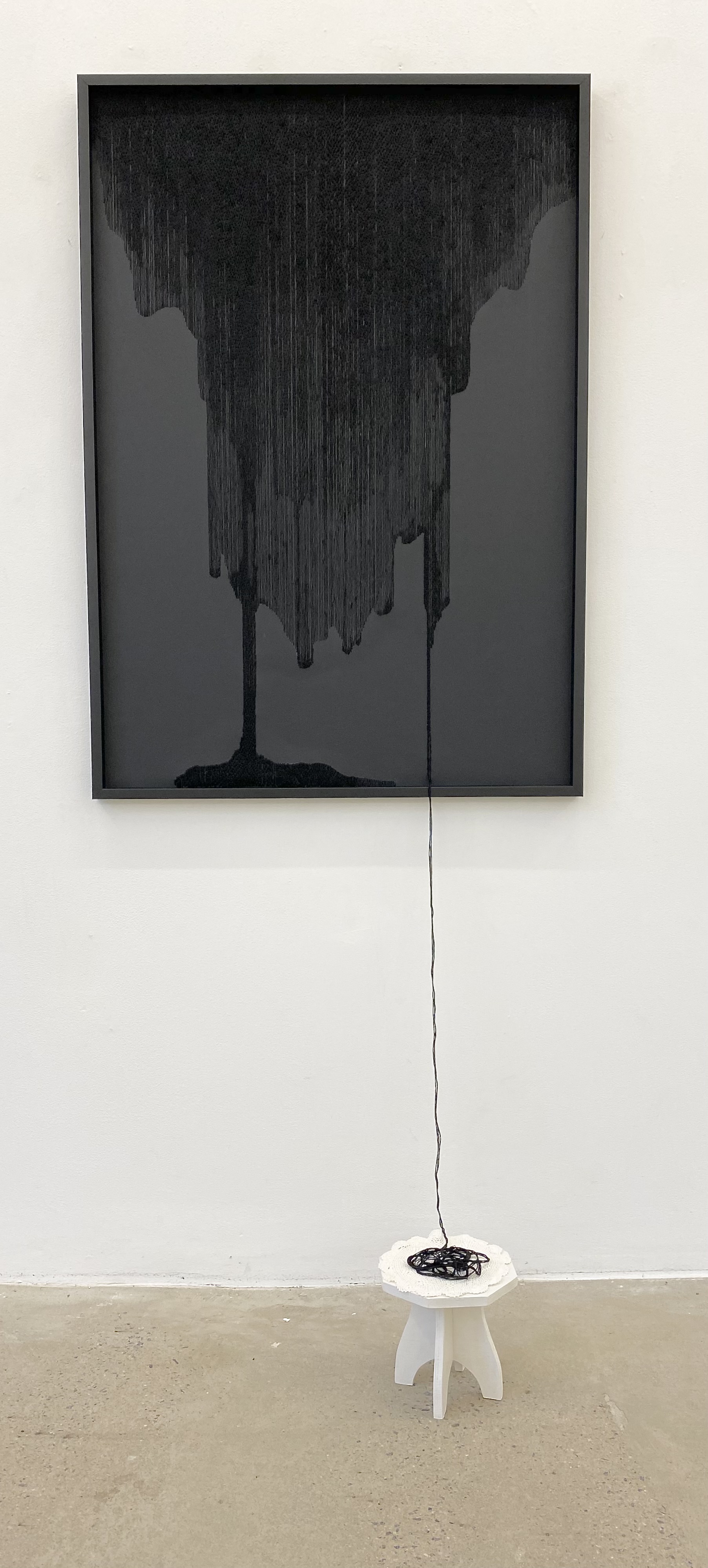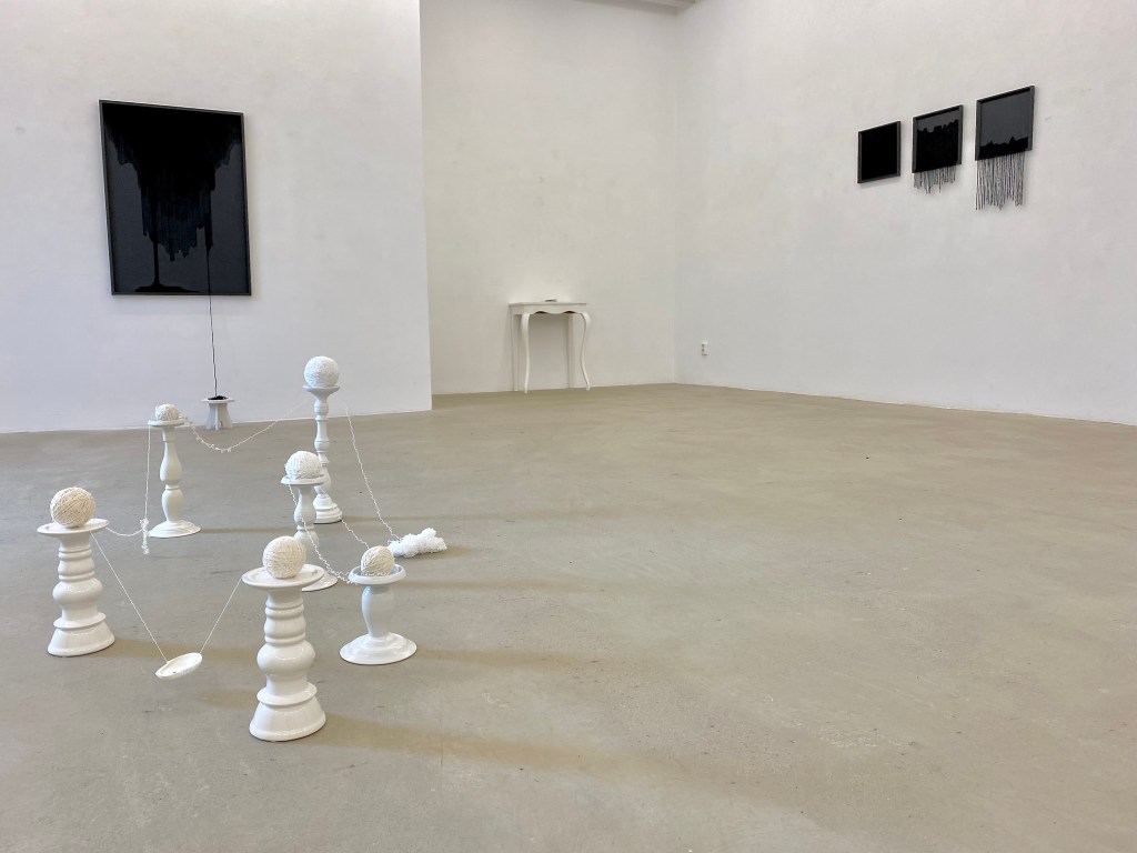 Utställningsvy Galleri Thomas Wallner, 2023/24Utställningsvy Galleri Thomas Wallner, 2023/24Mörkt, mörkare, mörkast 2023, (triptyk), 33 x 61 cm, 33 x 47 cm, 33 x 33 cm, broderi på papperMörkret faller 2023, 100 x 70 cm, broderi på papper, träpiedestal, virkad dukMörkret sänker sig 2023, 100 x 70 cm, broderi på papperMörkret sänker sig 2023 (detalj)Mörkerseende 2023, (diptyk), 70 x 50 cm + 70 x 50 cm, broderi på papperMörkerseende 2023 (detalj)Tröst 2023, installation – broderad bok, virkad spetsduk, träbordTröst 2023, (detalj)Tillit 2023, assemblage – uppriven virkad spetsduk, betongljusstakarTillhörighet 2023, assemblage – upprivna virkade spetsdukar, ljusstakar
