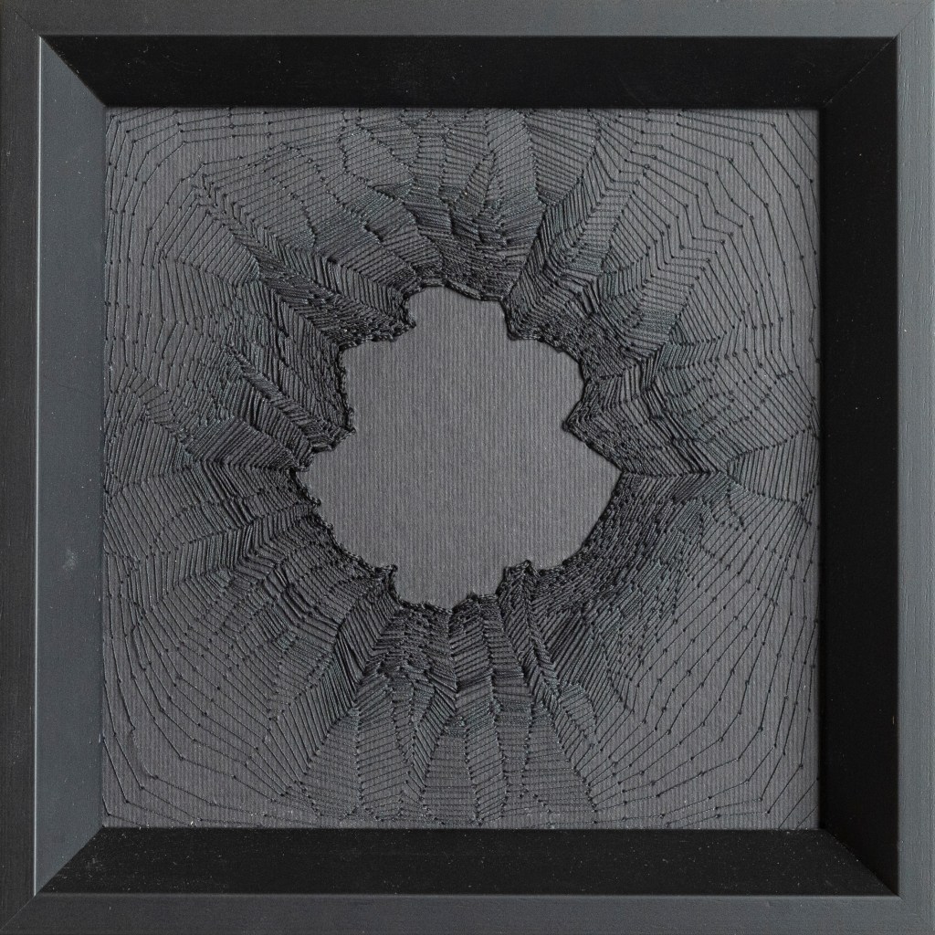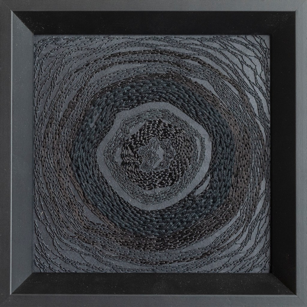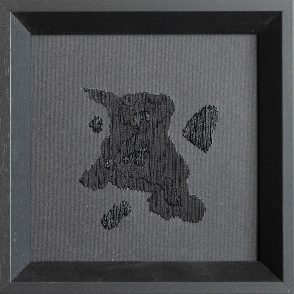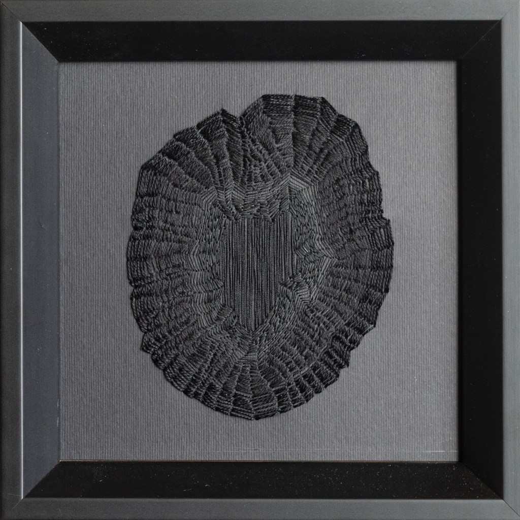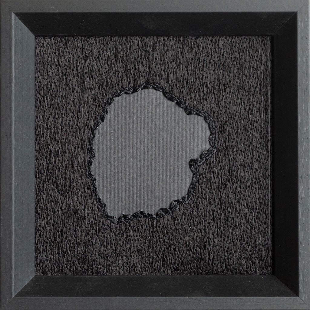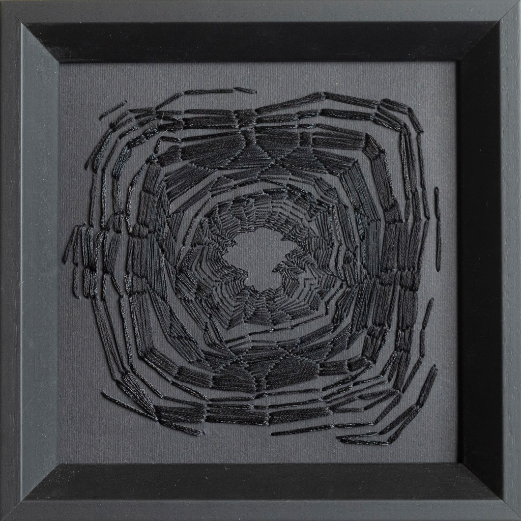 En pågående serie med handbroderi på papper, 15×15 cm, påbörjat 2024. Inspirerat av kosmologiska texter om universums svarta hål och dess associationer till psykologiska mörka tillstånd.