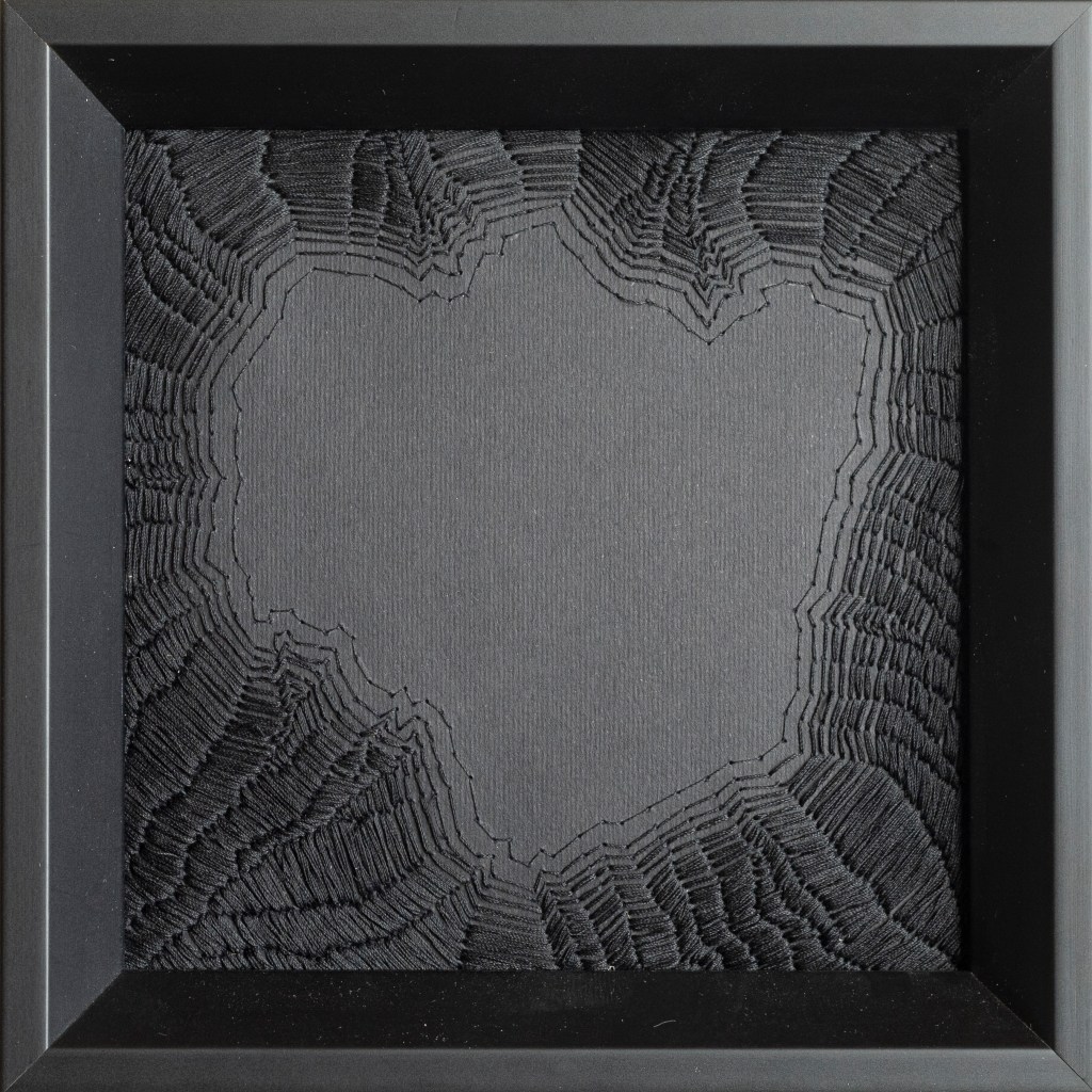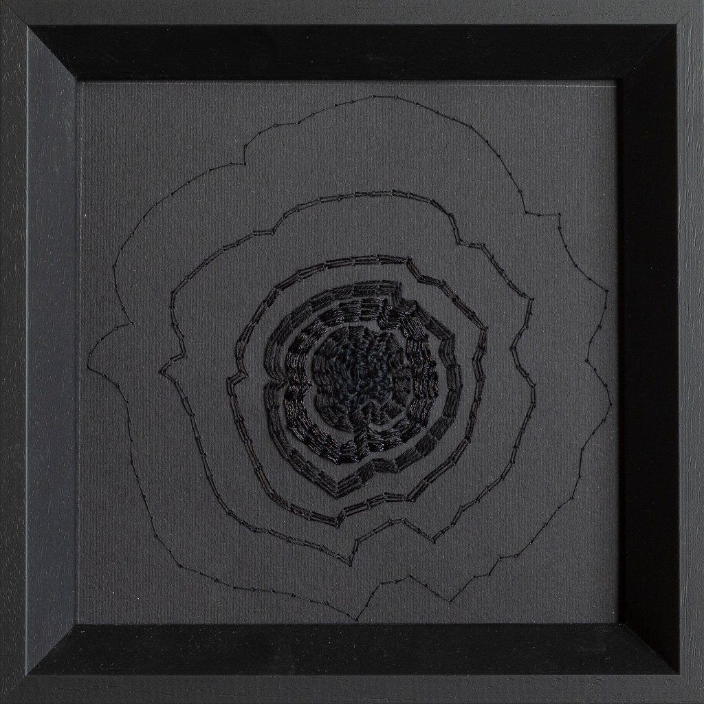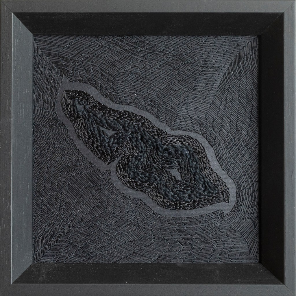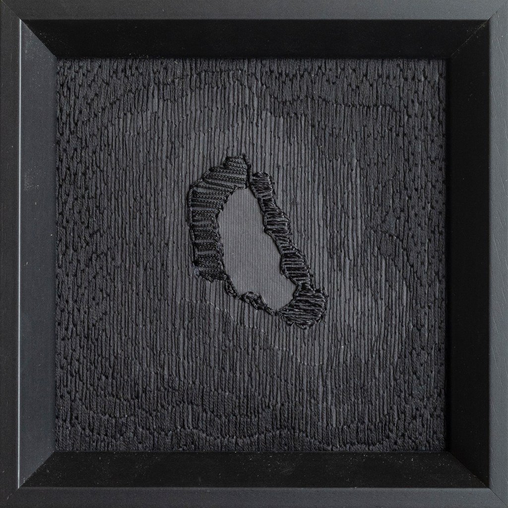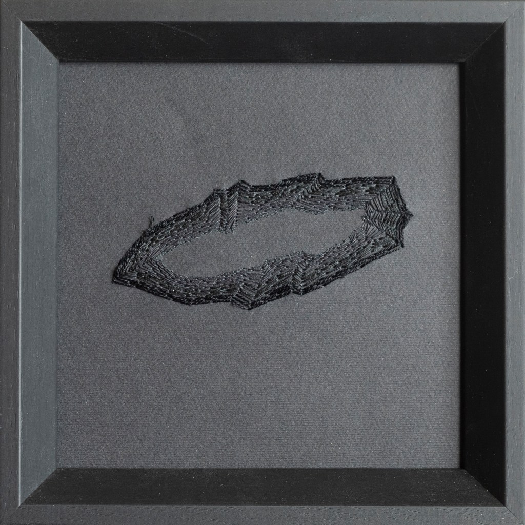 En pågående serie med handbroderi på papper, 15×15 cm, påbörjat 2024. Inspirerat av kosmologiska texter om universums svarta hål och dess associationer till psykologiska mörka tillstånd.