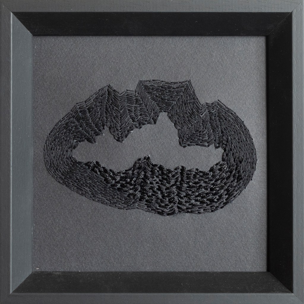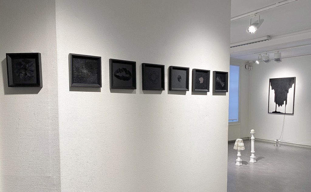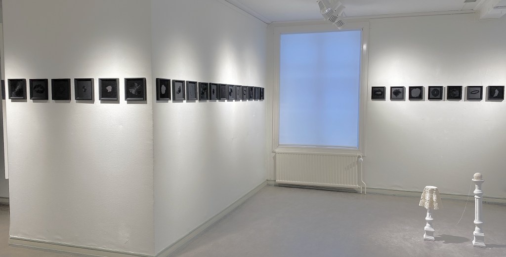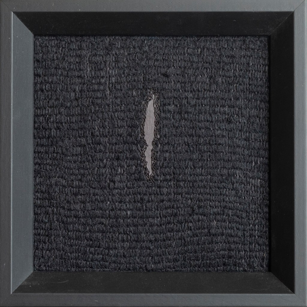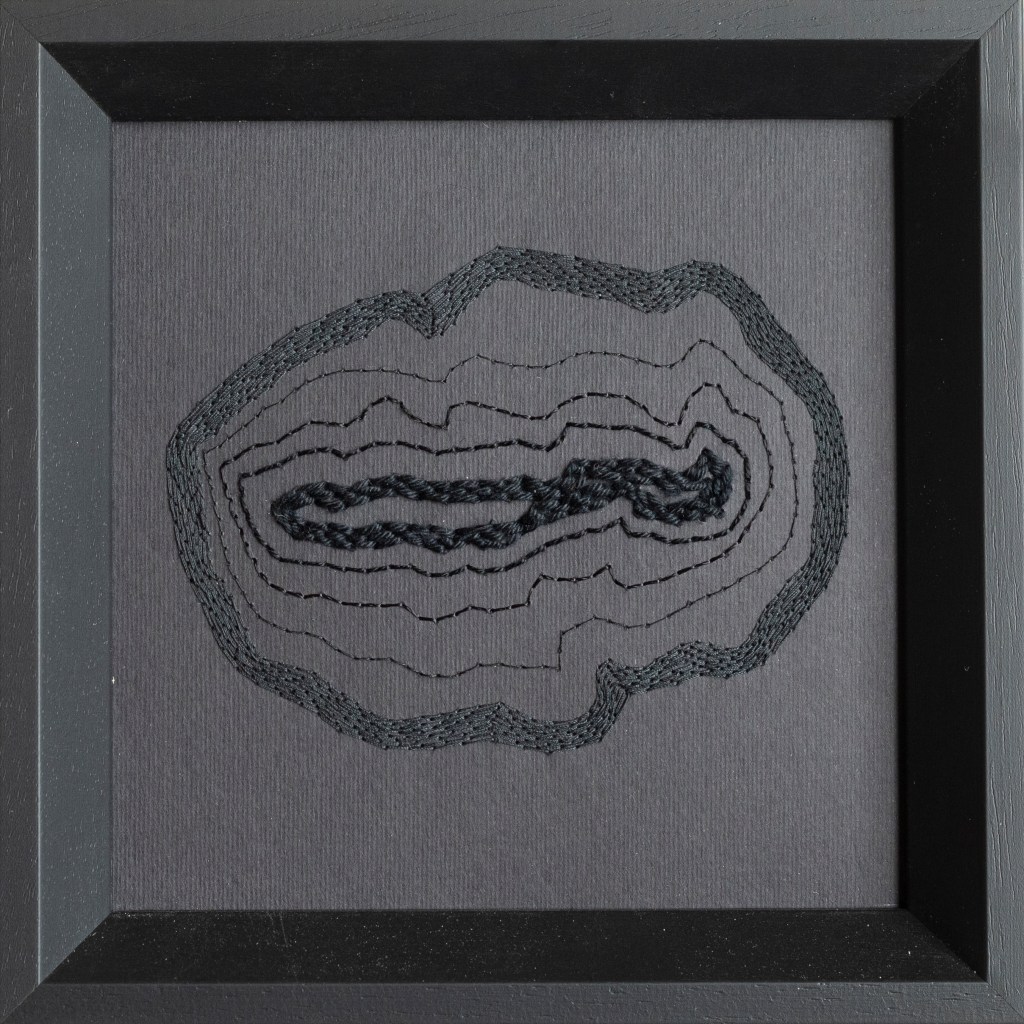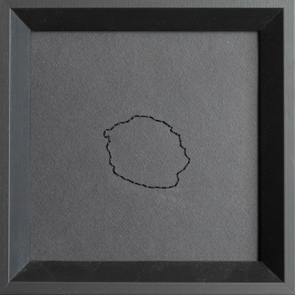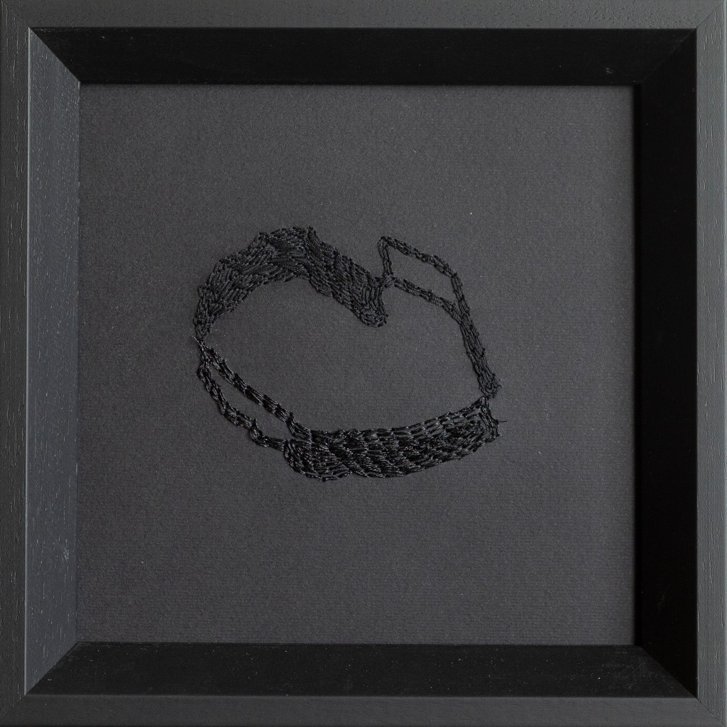 En pågående serie med handbroderi på papper, 15×15 cm, påbörjat 2024. Inspirerat av kosmologiska texter om universums svarta hål och dess associationer till psykologiska mörka tillstånd.