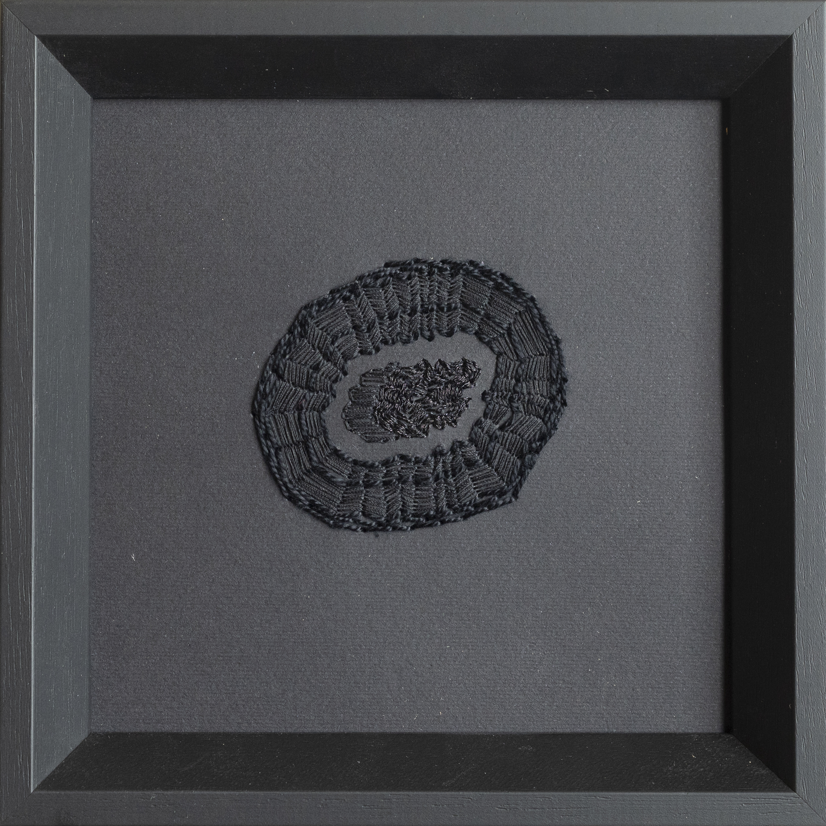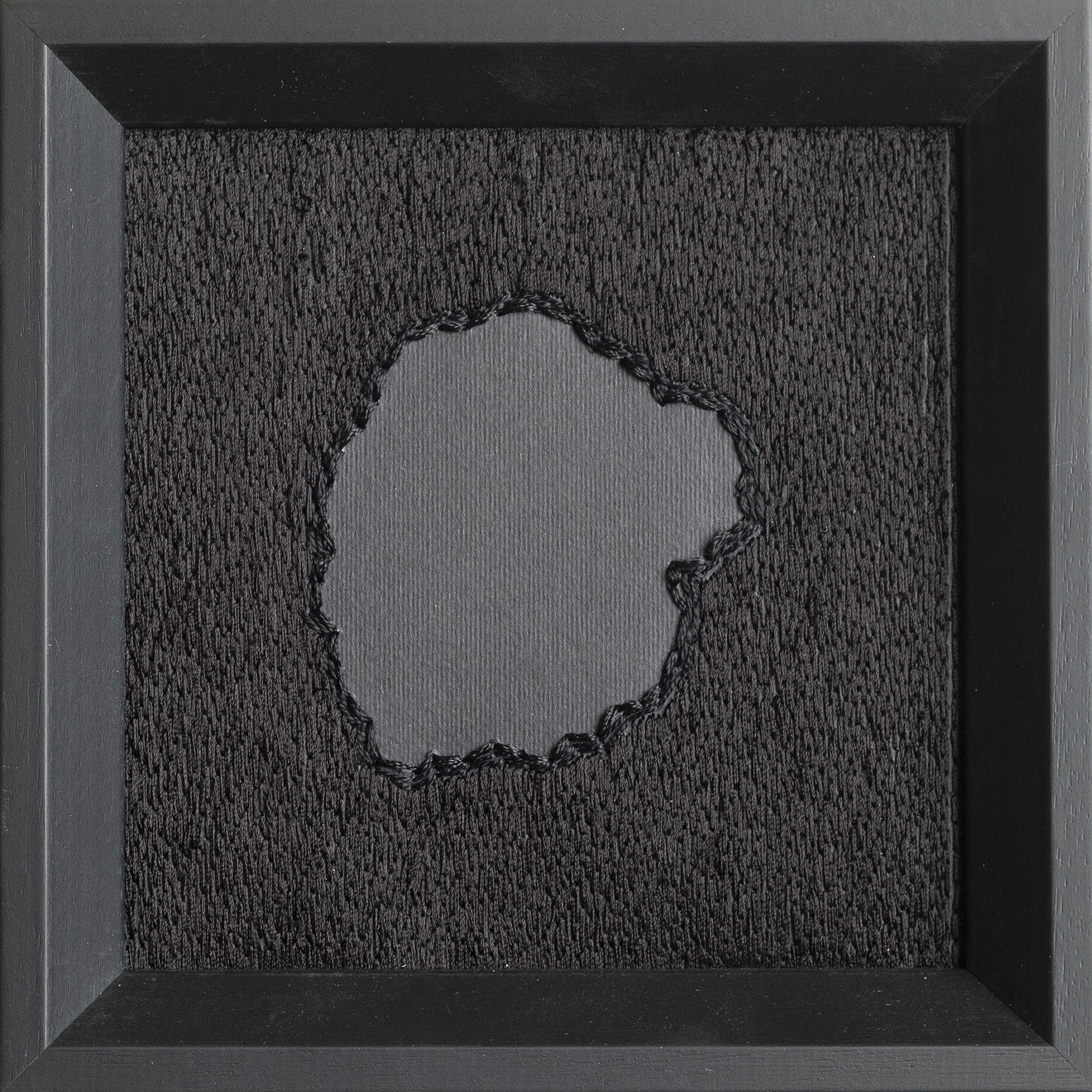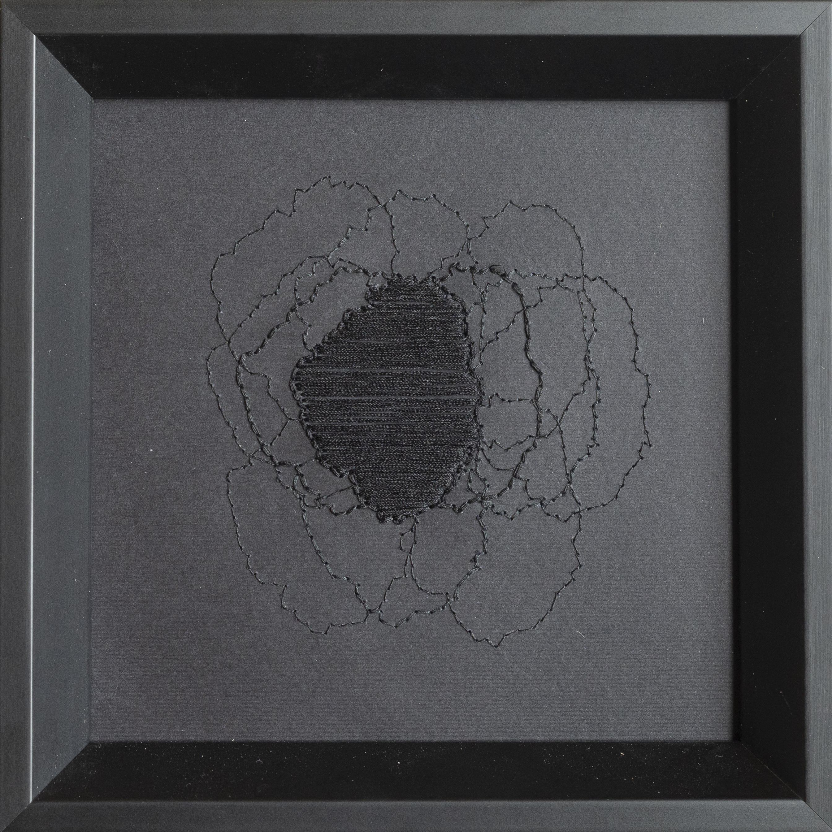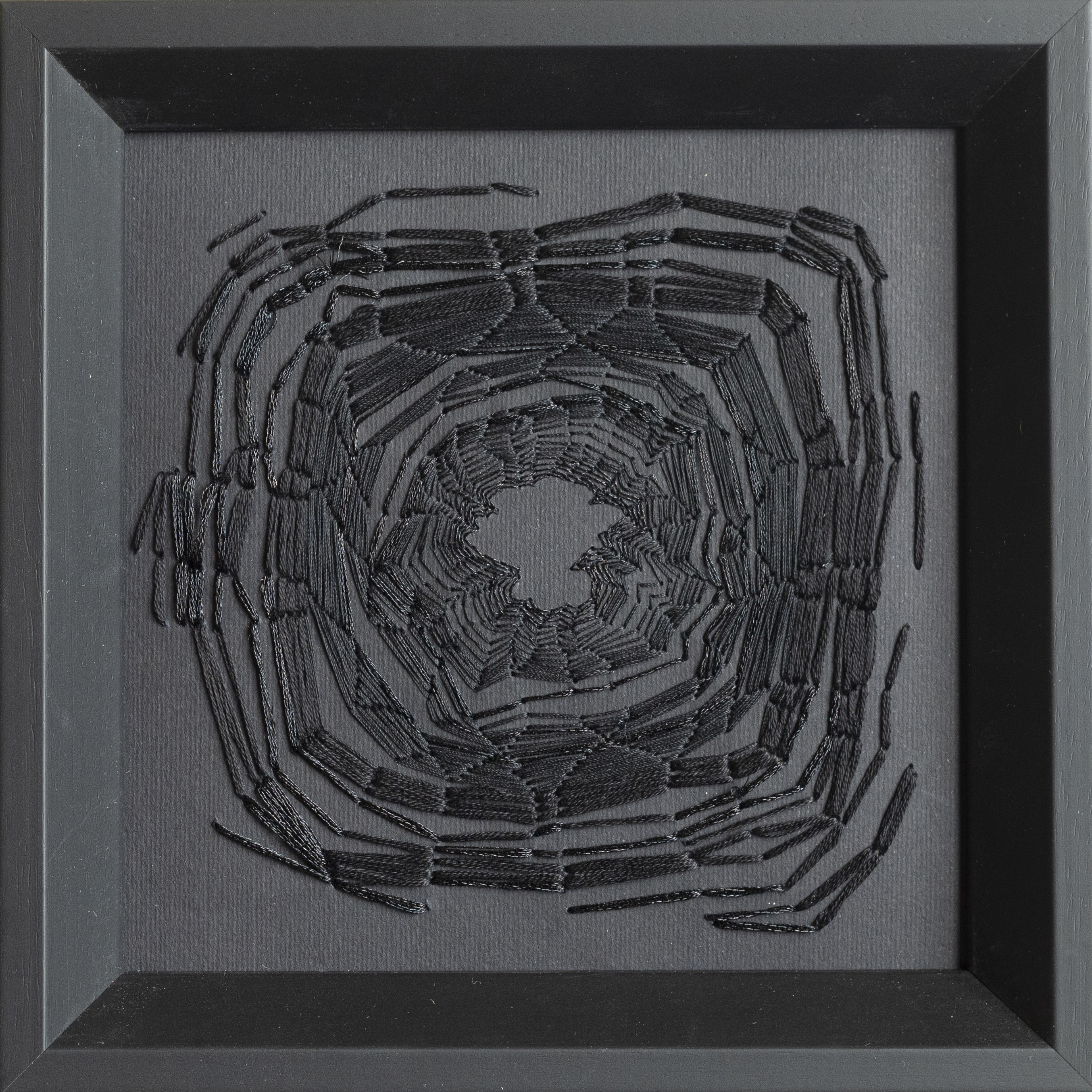 En pågående serie med handbroderi på papper, 15×15 cm, påbörjat 2024. Inspirerat av kosmologiska texter om universums svarta hål och dess associationer till psykologiska mörka tillstånd.