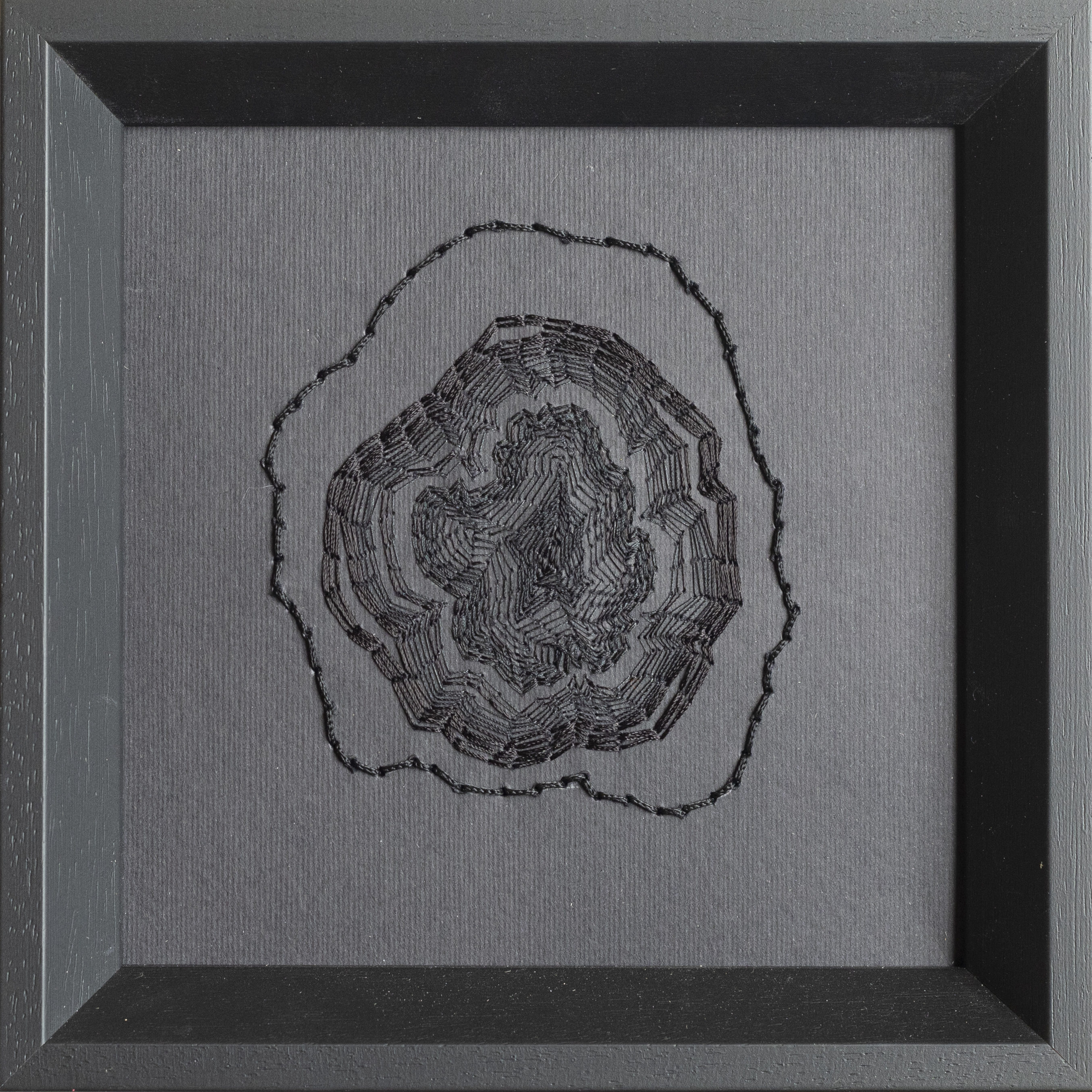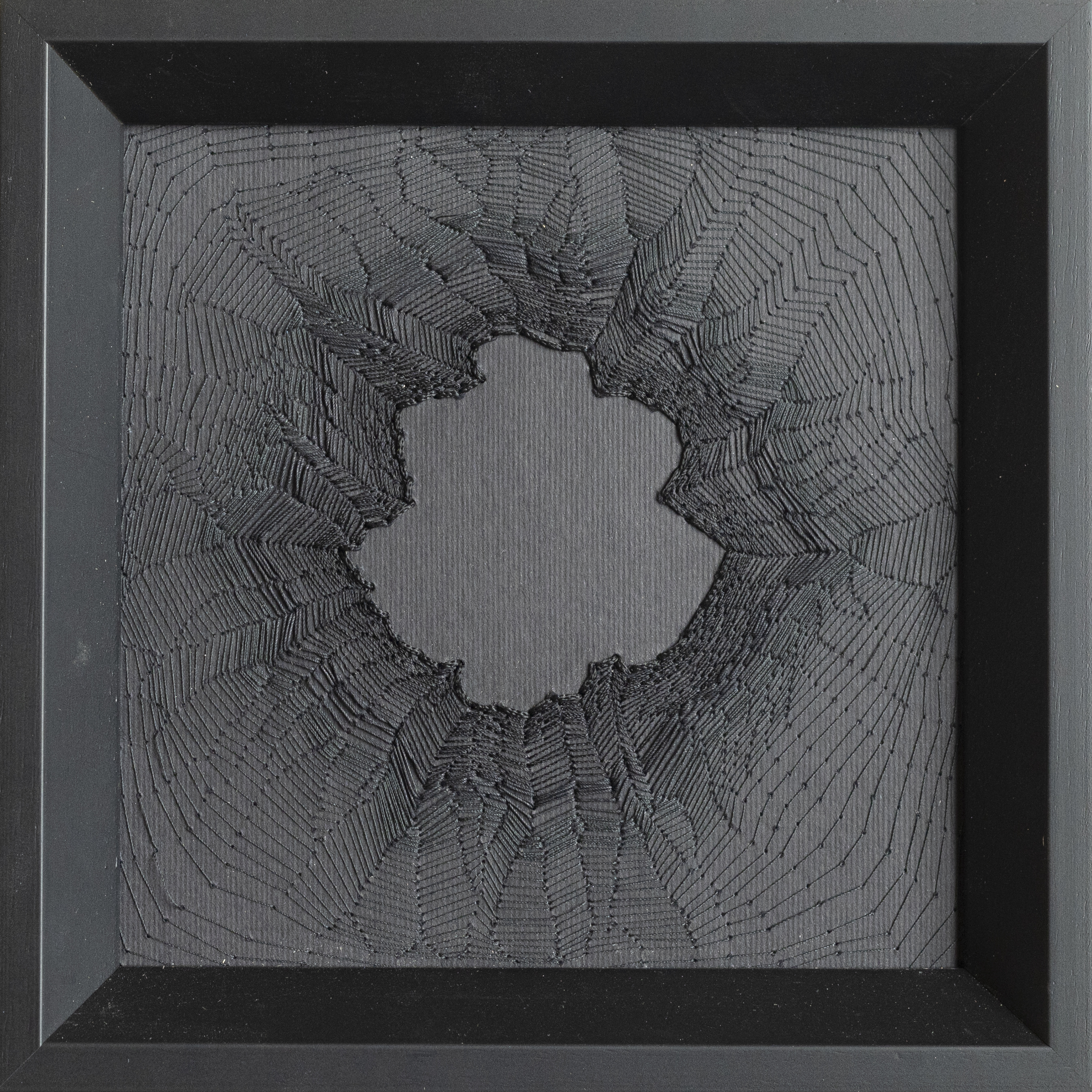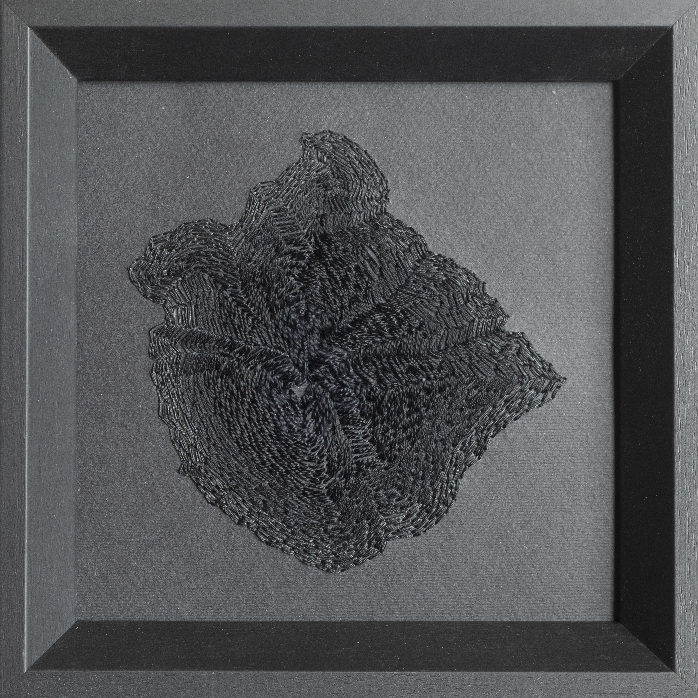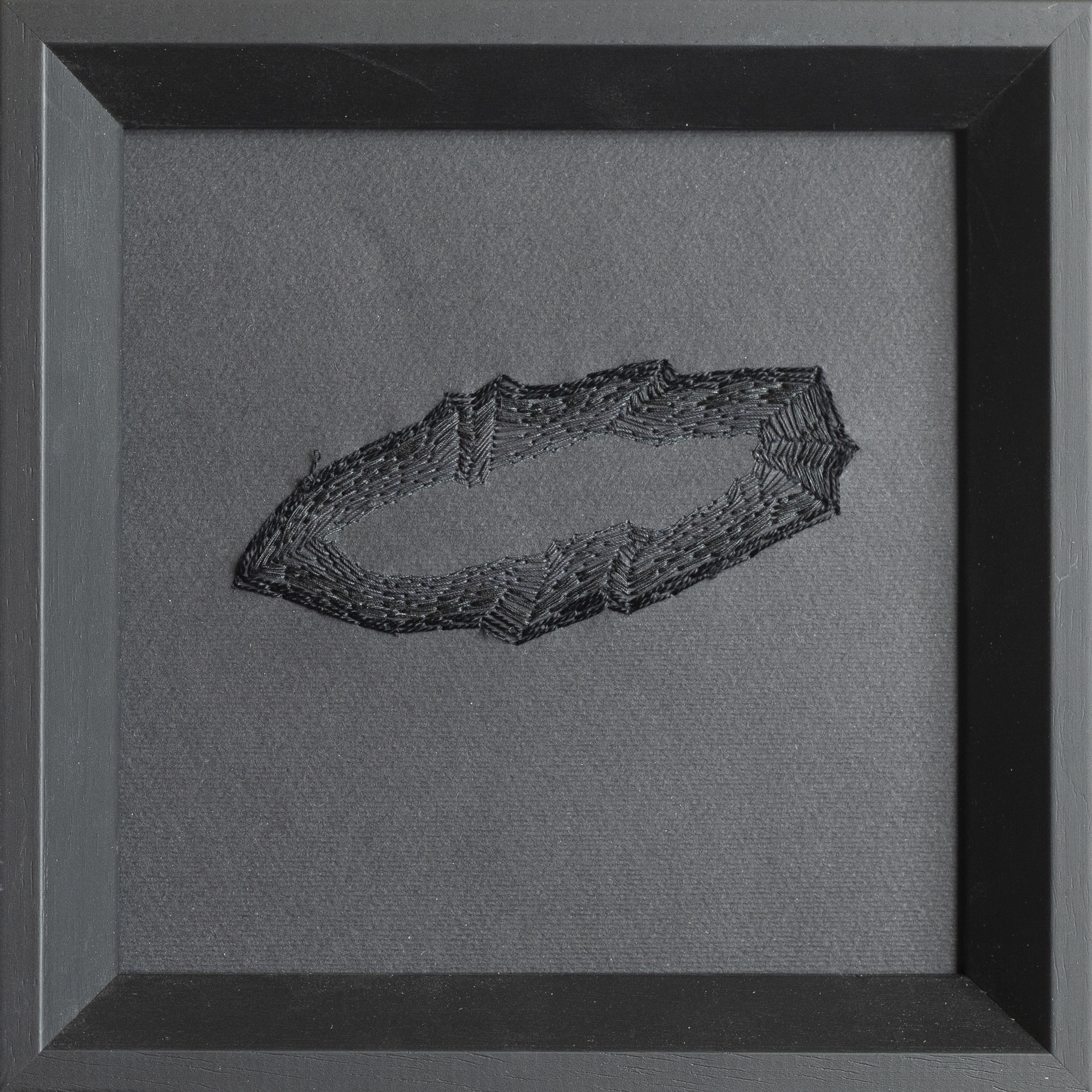 En pågående serie med handbroderi på papper, 15×15 cm, påbörjat 2024. Inspirerat av kosmologiska texter om universums svarta hål och dess associationer till psykologiska mörka tillstånd.