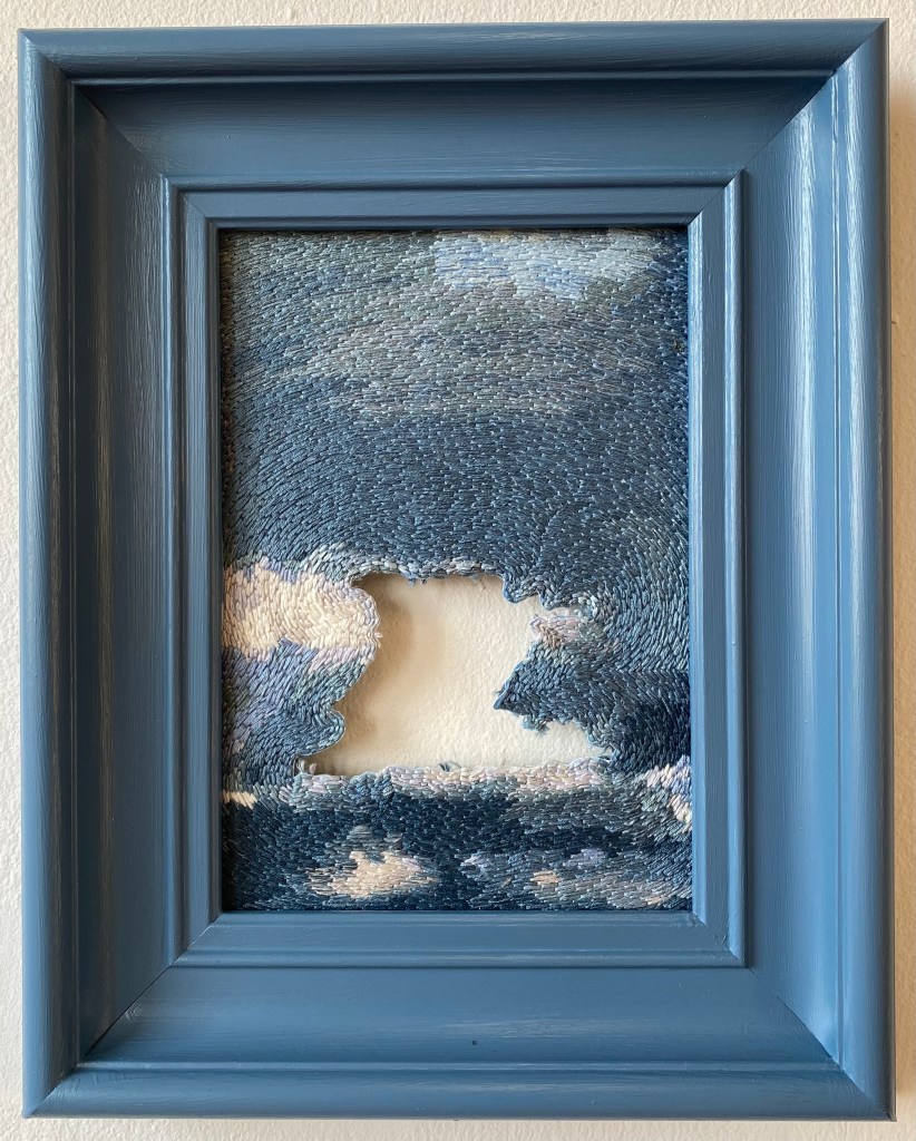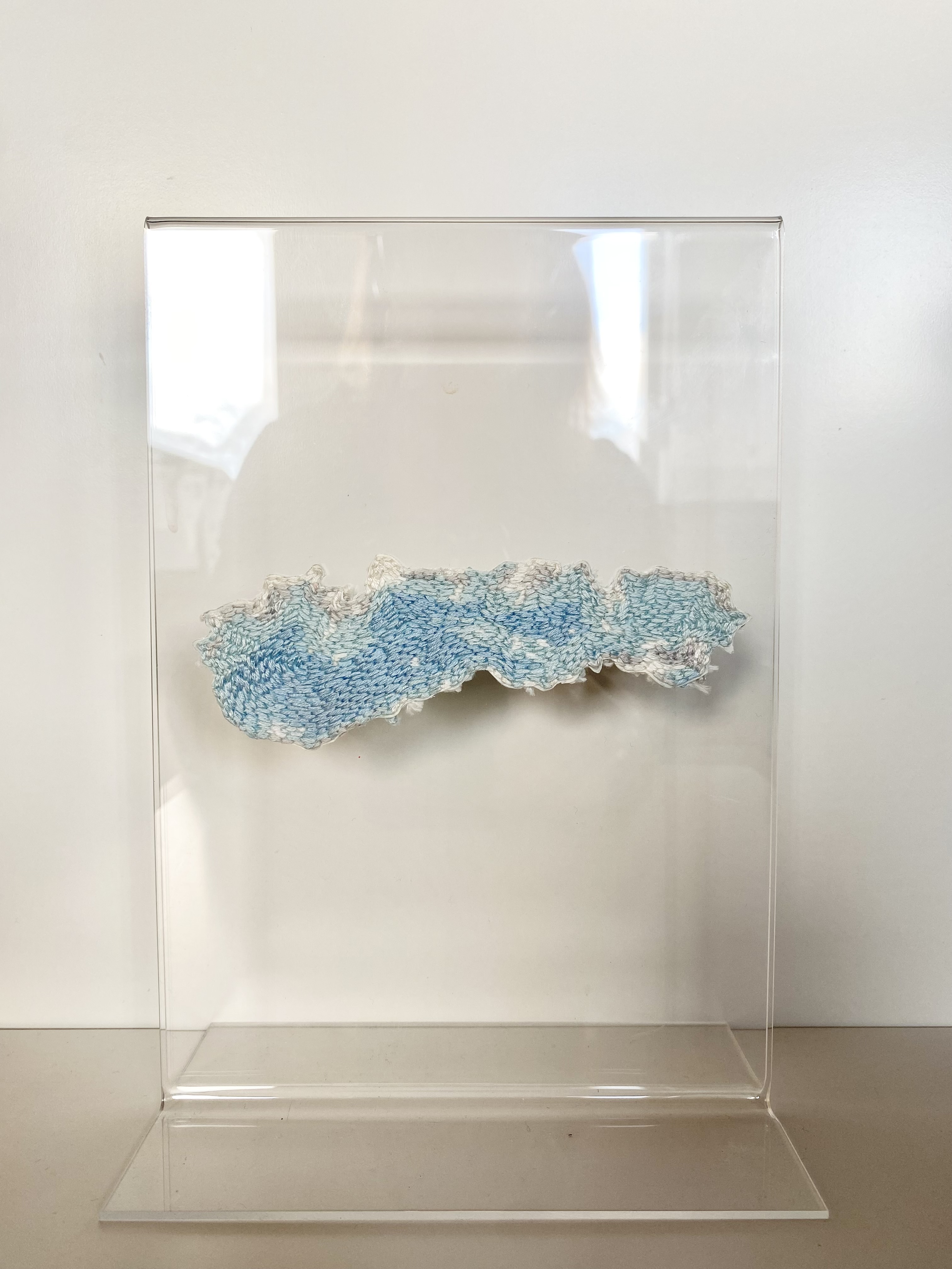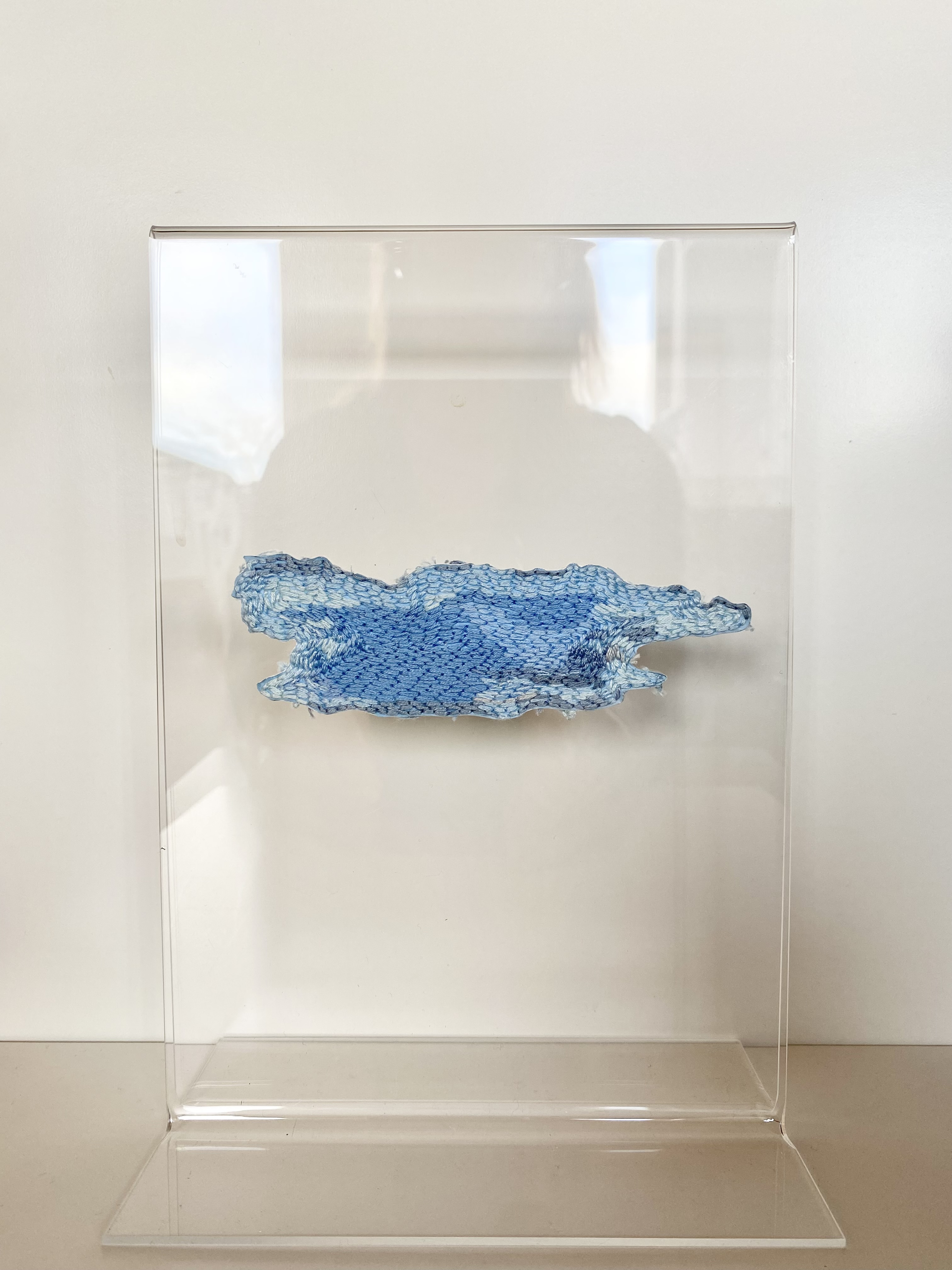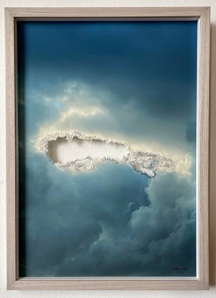 ”The light” #1-3, 2026 – broderi på fotografi (utskuret och monterat i stående plexiram) 20 x 15 cm