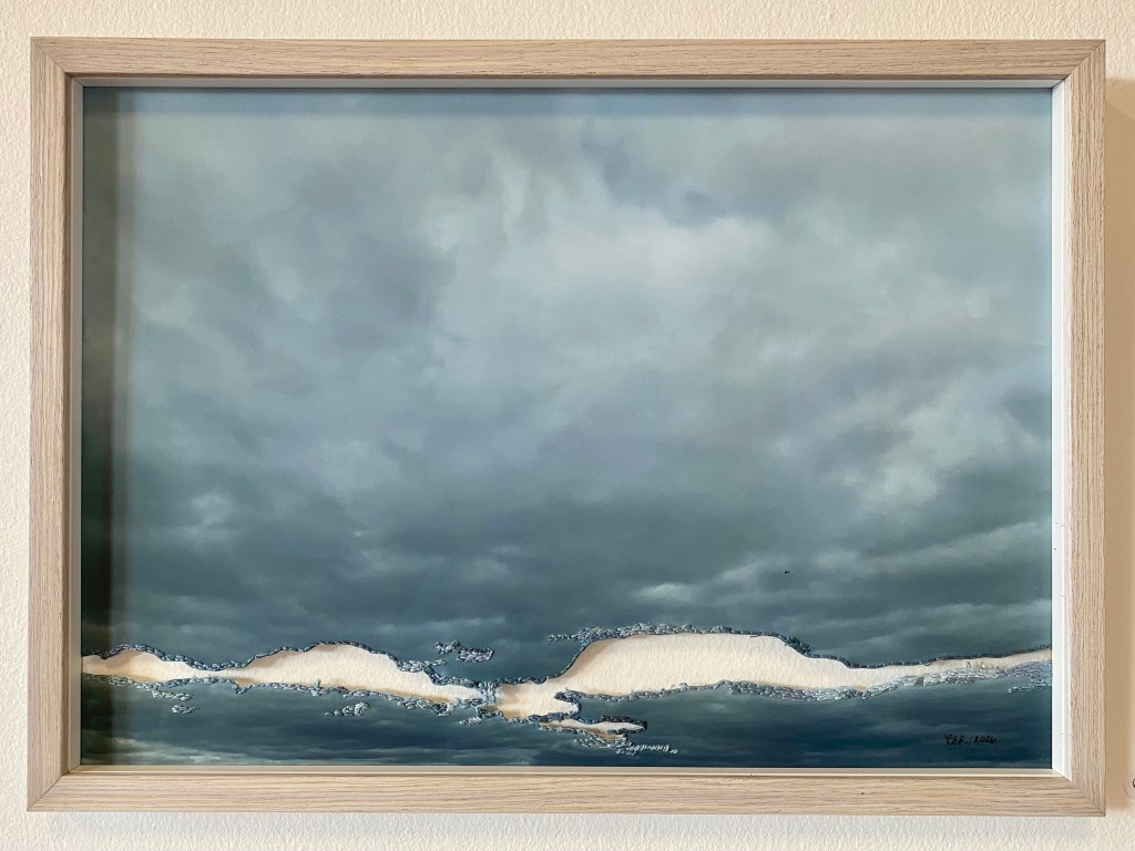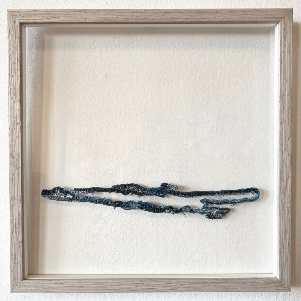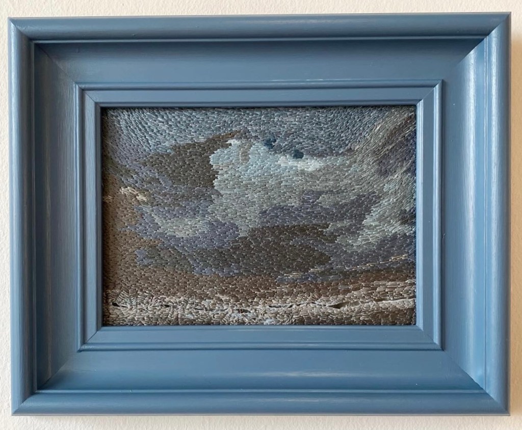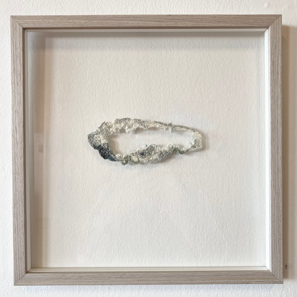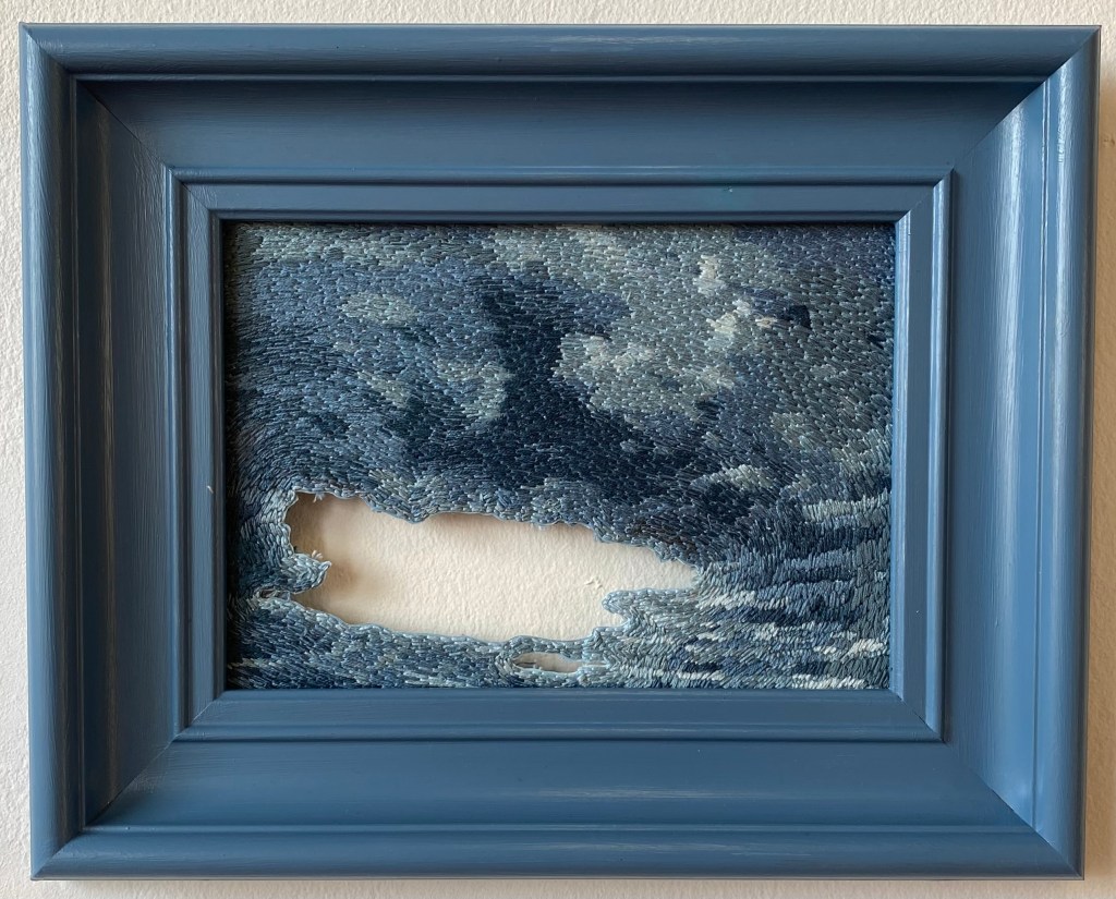 ”The light” #1-3, 2026 – broderi på fotografi (utskuret och monterat i stående plexiram) 20 x 15 cm